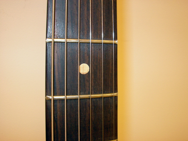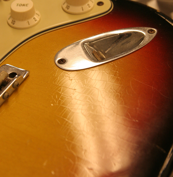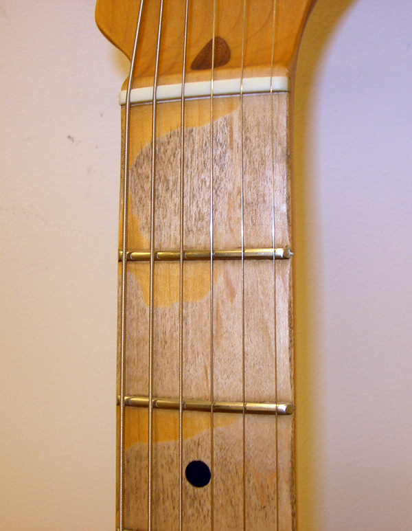 ハイフレット部の指板の塗装剥がれ処理も派手。