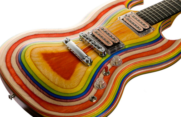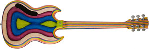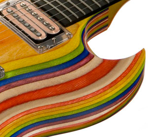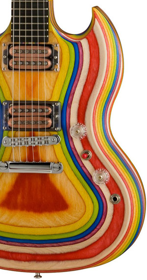 レインボーカラーとなったZoot Suit SG、もちろんこの模様は塗装によるものではない。予め染色されたバーチ材を幾重にも張り合わせたブロック材を削り出すことで生まれるラインだ。