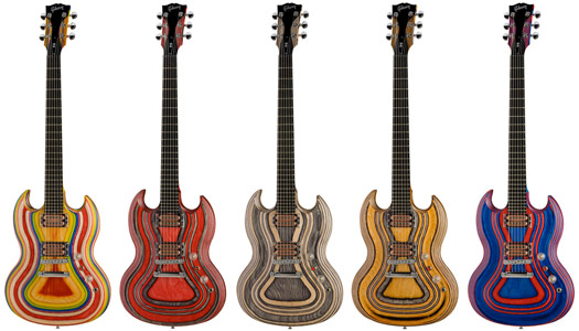 今回、Zoot Suit SGには、Rainbow、Black&Red、Black&White、Black&Natural、Red&Blueの5パターンのカラーが発表される。ギブソン・ロゴがプリントされたギグ・バックが付属するが、ツアーなどで酷使することが予測される場合は、別途ハードケースをご入手いただきたい。
