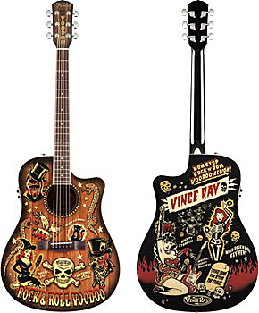 Hot Rod Designシリーズを手掛けてきたVince Rayが、これまでで最も奇異なモデルを製作。自身の名を冠したド派手なモデルは、まさにロックンロールの騒乱。ガイコツ、オートバイ、黒猫にヘビ……。B級映画の悪夢をVince Rayが描き出す。トップにスプルース、サイド/バックにマホガニーを使用し、クォーターソーンのスキャロップドXブレイシングを施したドレッドノート・ボディは素晴らしいサウンドを生み出す。チューナー付きFishman Isys IIIピックアップを搭載し、あらゆる場面でグッド・サウンドを響かせる。世界限定500本。