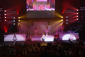 その後、ライヴスタート! ゲームの映像をバックに流しながら、実物の声優が歌うという、2倍楽しめる演出だ。3曲を歌い終わったところで、出演者10名が並び、自己紹介。役のイメージになった声優陣は、声だけでなく姿でもプロデューサーの心をつかんでいた。
