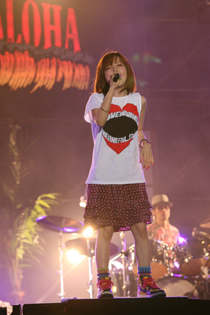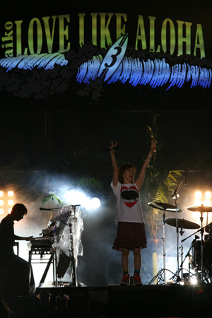 大観衆の無数の手拍子の中、待ちに待ったaikoが登場し、「キラキラ」のイントロとaikoの“イェーイ!”の掛け声に、会場のテンションはいきなり最高潮に。夏にぴったりの「花火」や「ボーイフレンド」が続き、ビーチに作られた60mもの花道を駆け抜けると、会場は大盛り上がり。最新シングル「KissHug」では突然降り始めた霧雨が幻想的な世界観を演出し、誰もが静かに酔いしれていた。