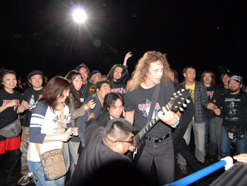 アンヴィルが代表曲「メタル・オン・メタル」を演奏すると、前方に殺到したオーディエンスを中心にして場内はたちまちライヴの熱気に包まれた。映画の中でアンヴィルへの想いやアンヴィルへの愛おしさが募った観客たち…そんな涙腺を緩ませる気持ちMAXの状態で、本人が目の前に登場したのだから、異常な興奮も当然のこと。