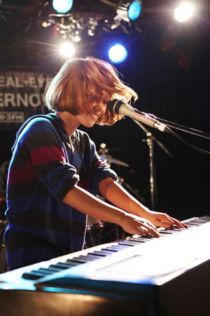 次に登場したのは、最後のインディーズアルバム『コンドウマニア4』が発売になり、2010年にはメジャーデビューを控えている近藤夏子。「近藤夏子で~す」と元気に登場。ニューアルバムからの「信号破壊」「リハーサル」を続いて披露。激しく身体を動かしながら演奏するキーボードと、ハリのある歌声は非常にパワフルだ。変幻自在に変わる表情はときにかわいらしく、時に激しく、オーディエンスを圧倒しながらもどんどん引きつけていく力強いライブを見せ付けた。