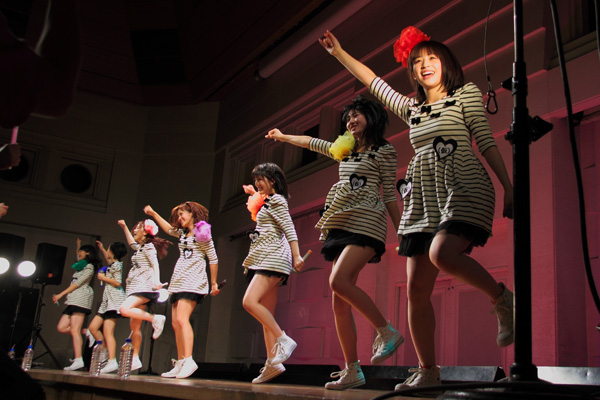 3回の公演のうち、18時スタートの第19回公演は、タンポポの「I&YOU&I&YOU&I」カヴァーからスタート(スマイレージもイベントなどで披露しているが、オリジナルはタンポポの楽曲)。バレンタインデーが近いということもあり、メンバーは、自分たちの画像がプリントされたチョコレートを客席に配りながら入場してくる。ちなみにこの日の衣装は、いつもの「(仮)Tシャツ」ではなく、(仮)ワッペン付きがついたおそろいのワンピースだ。