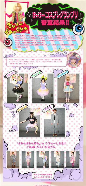 ライブに続いて、きゃりーコスグランプリの発表も行われた。「本当にみなさん素敵な格好をしてきてくださって、選ぶのが大変でした」とのきゃりーの言葉通り、かなりの強者揃いとなった当イベントだったが、ミニアルバム『もしもし原宿』のジャケット写真のメイクを施した男性が革命賞、きゃりー自身もやっているベジータみたいな前髪をしてきた女の子がぷちぱみゅ賞、きゃりーが実際持っているアイテムをたくさん身につけていた女の子がぱみゅぱみゅ賞、小さいながらきゃりーらしい格好できてくれた女の子がきゃりー賞、そしてグランプリには「つけまつける」のPVで身につけた衣装と豆しぱみゅぱみゅのぬいぐるみを自分で作って参加してくれた女子が選ばれた。
