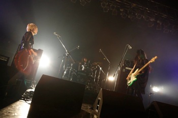 yukihiroのDJ後、間もなくして幕が上がると最初のライヴ・アクト=ZZZ’sがステージに現れる。YOUKAKU(G&Vo)、YUKARY(B&Vo)、LYN(Dr)から成る神戸発のガールズ・バンドは、冒頭から鬼気迫るパフォーマンスを展開。ヘヴィなドラミングとうねるベース、金属音のようなギターが火花を散らして拮抗する「dystopia」を筆頭に、およそ3ピースとは信じがたい音圧とアイスピックを思わせる鋭利かつ凶暴的なアンサンブルで観る者を圧倒。場内の熱は徐々に、しかし目に見えて高まっていった。昨年はアメリカの著名音楽イベント<SXSW 2012>に出演を果たし、その後拠点をアメリカに移し活動。11月からはヨーロッパツアーも決行するなどボーダーレスな活動を繰り広げる実力派たる、実に鮮烈なステージだった。