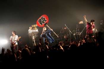 しばしの転換後の28時10分、いよいよacid androidがステージに立つ。今回のバンド・フォーメーションは、今年4月のLIQUIDROOMワンマン公演と同じく、ギターにLillies and RemainsのKENT、ドラムにPeople In The Boxの山口大吾を迎えた3ピース編成(+マニピュレーター)だ。KENT、山口に続いて、細身のシャツに柄パン、そして腰から足先までの長いストールを纏ったyukihiroが姿を現すと