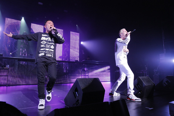 この日は、東京NHKホールの2日目公演だ。ShenとMicroが雄大なビジョンを背景にハグを交わし、ニューアルバム『24/7』から「Marathon」でスタート。満員の観衆からは一気に大歓声だ。2人はステージを縦横無尽に疾走し、ダンスビートEDMで途切れることなくオーディエンスを煽る。