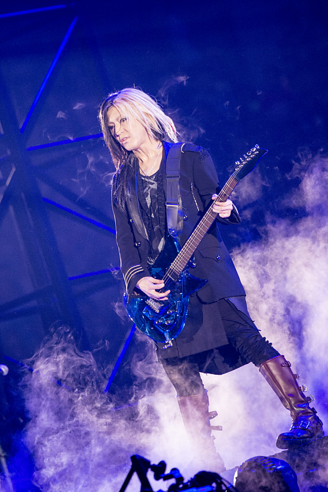 まずはオープニング。会場が暗転すると、交響曲「ツァラトゥストラはかく語りき」が鳴り響くなか、舞台上にあった巨大な筒状のLEDがリフトアップ。その中から10年前に東京ドーム公演でTERU(Vo)が「10年後に取りに来る」とステージに残していった白いジャケットが降りてくるのと同時に、アリーナ後方にメンバーが登場。4機の真っ白いビッグバルーン(直径7.3m)にTERU、TAKURO(Gt)、HISASHI(Gt)、JIRO(B)が次々と乗り込んでいく。彼らは地上30mまで上昇したバルーンの中でアリーナ席からスタンド最上階までを見渡し、移動するバルーンにあわせ、集まったオーディエンスみんなに挨拶を届けながらじっくり時間をかけてステージへと向かった。