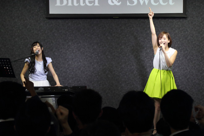 さらなる発表として、12月23日に1stミニアルバムの発売が明らかにされる。観客の驚きの声と拍手を体で受けるように、大きく手を上げて笑顔をみせる田崎、そして長谷川。このミニアルバムには、「Rolling Days」のBitter & Sweetバージョンのほか、ライブで歌ってきた音源化されていない曲や新曲が収録されるとのこと。「ほんとにみなさん、お待たせいたしました! という気持ちでいっぱいのアルバムです。まだレコーディングはしていないのですけども、近いうちにとりかかって、みなさんの手元に届くと思います。」と、田崎。なお、ミニアルバムは、12月13日の<Bitter & Sweet 3rd SHOWCASE>初日公演会場(名古屋・鶴舞DAYTRIP)から先行発売される(なお、11月20日には田崎あさひのバースデーライブ<Bitter & Sweet 3rd SHOWCASE another edition -ASAHI TASAKI Birthday LIVE->が大塚Deepaにて開催される)。