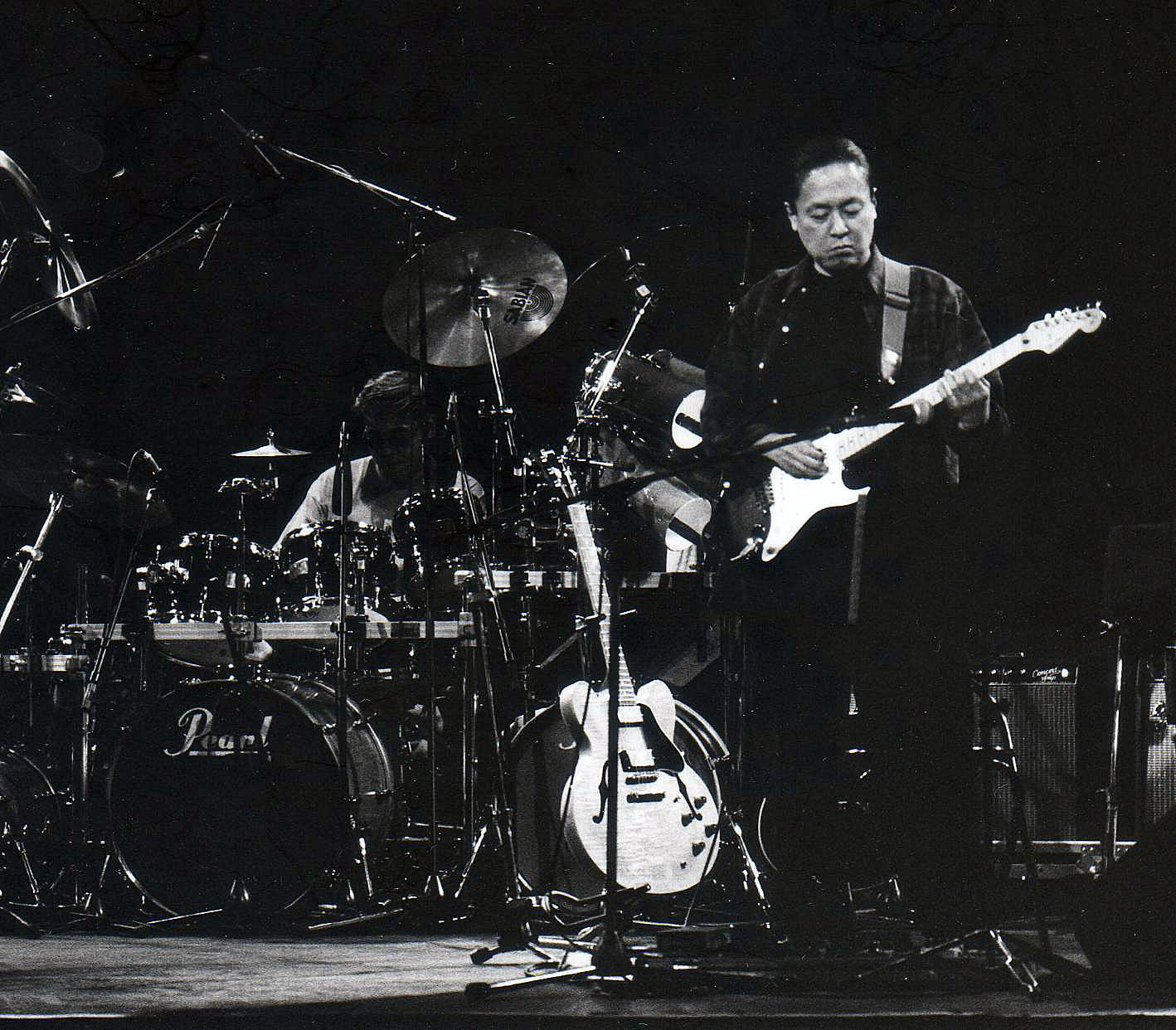 村上:そもそも俺にとっての憲司の最初の印象は、憲司がアマチュア日本一になったトリオをやってた時に、最初に聴いたラリー・コリエルのカバーなのよ。『レディー・コリエル』っていう名盤があって、ドラムがエルヴィン・ジョーンズで、ラリー・コリエルがフルアコを持ってヤバイことを弾きだした最初かな。それが憲司を最初に聴いた時の印象なんだよね。“なんだこいつら?”と思った。俺、当時はバンドボーイをやってたんだけど、その時になぜか“このギターの奴と将来やりたいな”と思った、それが最初なのよ。