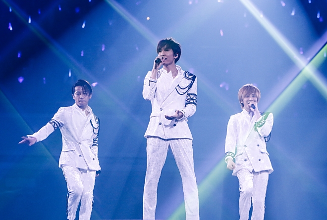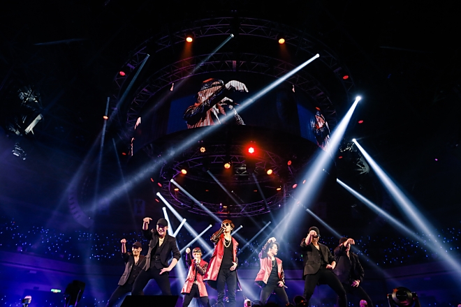 中央の円形ステージを中心に、東西南北に張り出したステージを回りながらそれぞれの方角のファンへとパフォーマンスを見せていく橘慶太、千葉涼平、緒方龍一のメンバー3人。彼らが歩を進めるたびに近くにいる観客から歓声が波のようにあがる。初期の名曲「SUPER LOVER ~I need you tonight~」ではサビの部分で観客席からコールが上がり、熱気で暖まった会場がひとつになる。