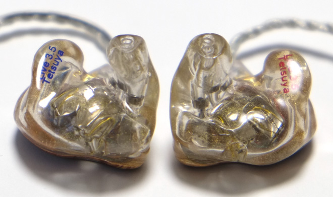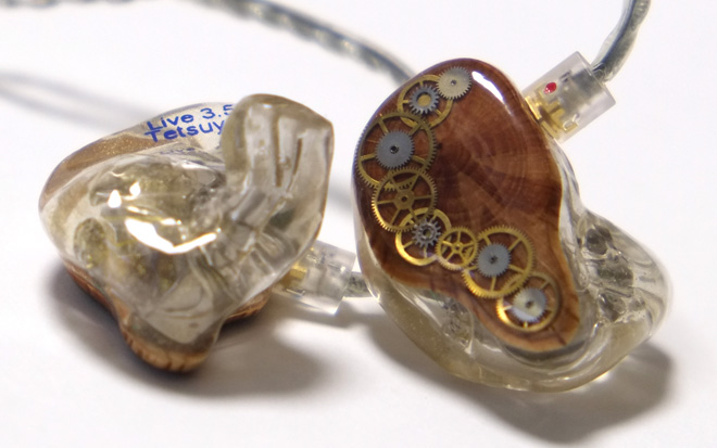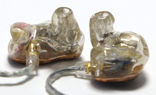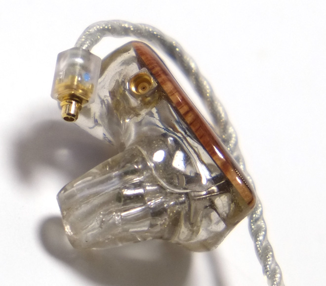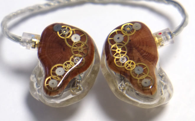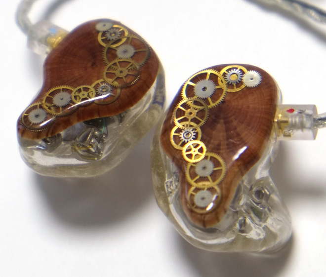 ご覧のとおりビジュアルも美麗、造形も見事でしっぽりとフィットする絶妙なハマり具合をみせる。高い遮音性が確保されながら耳へのストレスがほとんど感じられないので、装着感も世のカスタムIEMのトップクラスにあると断言できる。今回はフェイスプレートはウッドプレートを活かしながらにギアをあしらい、シェルにはゴールドの細かいラメが混ぜ込まれている。低域用ドライバーがソニオン33A007でCI-22955のような大型のものではないため、シェル自体もコンパクトにまとめられ耳からはみ出ることもない。