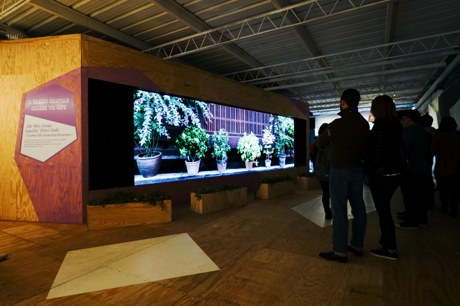 微細なLED素子を光源とする独自開発の高画質ディスプレイ技術を用い、広大なキャンバス画のように高解像度な映像を展開。今回は会場入口付近で、THE WOW FACTORYのコンセプトムービーを再生した。