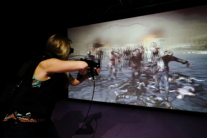 ■THE FIRST IMMERSIVE INTERACTIVE EXPERIENCE – Sony’s interaction technology ソニーグループが持つ最先端技術と映画『バイオハザード:ザ・ファイナル』(原題:Resident Evil: The Final Chapter)が持つ独自の世界観を掛け合わせる事により生まれたアトラクション。視覚や聴覚に加えて、触覚(Haptics)技術を用いる事により、実際に劇中のゾンビと戦っているような迫力ある没入体験を実現した。