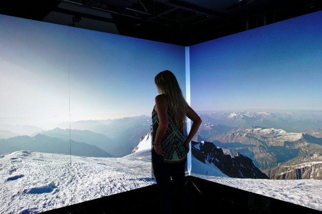 ■JUMP! TELEPORT AND IMMERSE YOURSELF – Mixed Reality CAVE experience 4K超短焦点プロジェクターを4台用いた全周囲映像空間CAVE型システム。 臨場感あふれる360度映像を複数人数で体験することにより圧倒的な没入感を共有できる場を提供する。