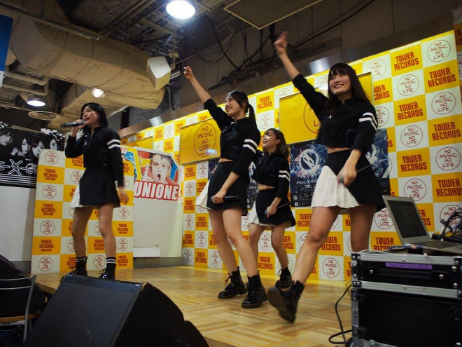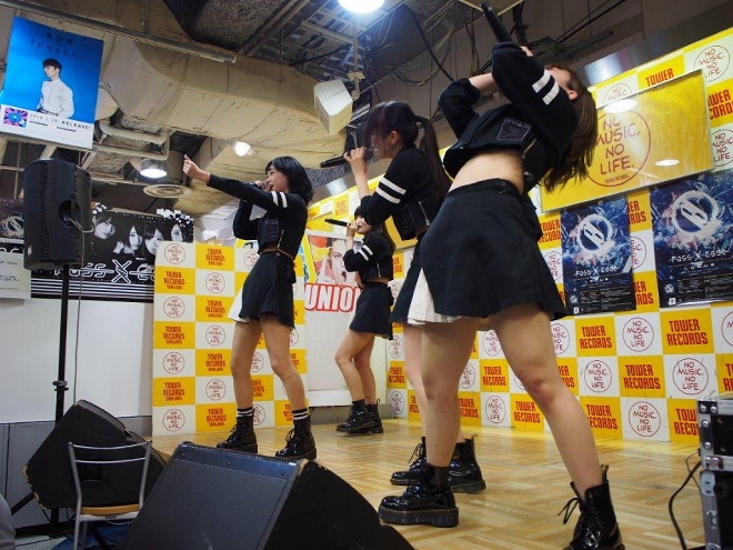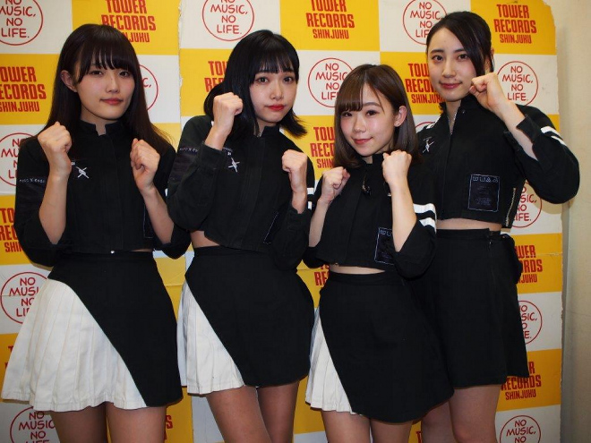 4日のタワーレコード会場には総勢約300名のファンがところ狭しとひしめき合い、キュートな“戦う4人組”の熱気あふれるライブ・パフォーマンスを見守った。整列時間から多数の男性ファンがタワーレコード新宿7Fのイベントスペースのステージ前に集まり、会場内はいっきに緊張感に包まれる。18:00の開演と同時にメンバーがステージに登場、会場からは割れるような声援が飛び交った。