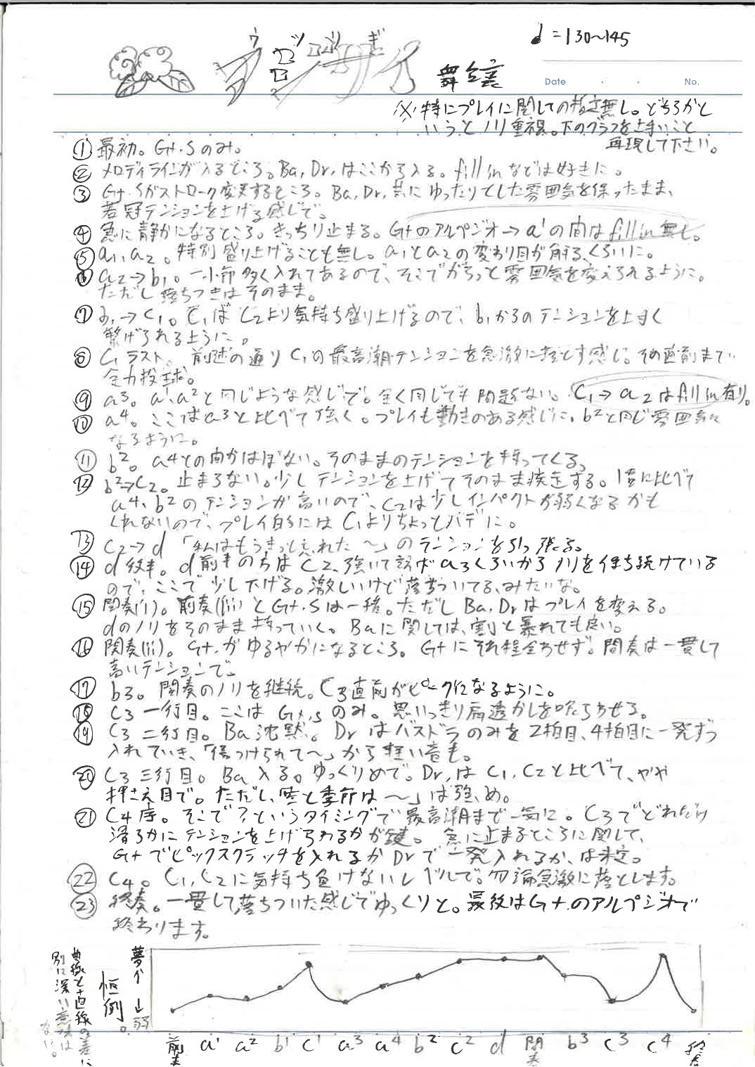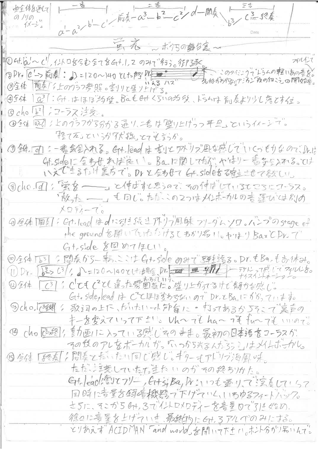 石川:「ここはこういうフィルをするから、ベースはそれっぽい感じでください」とか、曲のテンションとかも書いてあるんです。始めは上がる、ここでピークがきて、みたいな。これを中2でやってるんですよ。