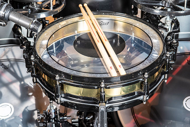 スネアは、シェルのサウンド特性を最大限に引き出すパール・オリジナルの“フリーフローティング”。これはyukihiroのシグネチャースネアでも採用されているもので、金属パーツを全て排除したシェルを打面ヘッドと下部のアルミシャーシではさみ込み、ラグポストで支えるシステムだ。ブラス製のシェルは、前述のとおり「ZI:KILLの時から使ってたもの」とのことなので1990年当時から所有しているシェルであり、自身のシグネチャーモデルからシェルを載せ替えている。サイズは14″×3.5″のピッコロ。ヘッドはレモのCSピンストライプ。Petit BrabanconではブラスシェルとCSピンストライプの鳴りを活かしたクリアでソリッドな方向性ということができるだろう。