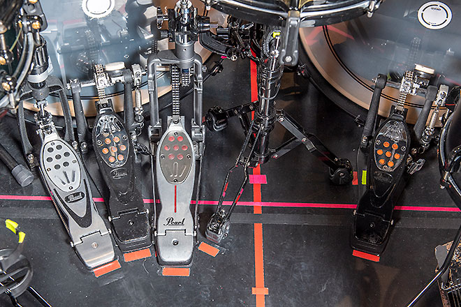 バスドラのフットペダルにはパール製のELIMINATOR II P-2100C(ダブルチェーン)を採用。ハイハットスタンドにはパール製のリモートハイハットスタンドEliminator REDLINE RH-2050とH-1000をセット。