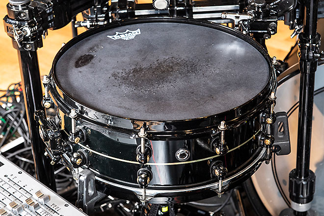 「ライヴでは僕がZI:KILLの時から使ってたものを持ってきました。初めて買った高価なスネアだったんですよ。シェルだけ交換できる特殊なスネアなので、そのスネアを使ってます」とは、1stアルバム『Fetish』インタビュー時のyukihiroの言葉だ。前述したようにPetit BrabanconではL’Arc-en-Cielと同じドラムセットを使用しているが、異なるのはスネア。ヘッドもこれまでとは違うものをセレクトしている。