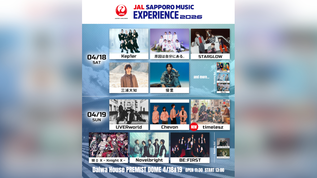 札幌ドーム開催<JAL SAPPORO MUSIC EXPERIENCE 2026>出演者第3弾にtimelesz