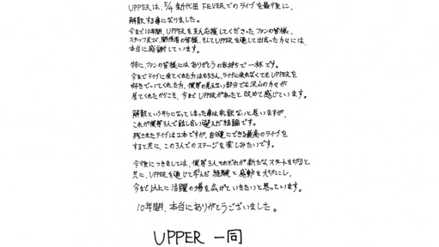 UPPER、2本のライヴを最後に10年の活動にピリオド