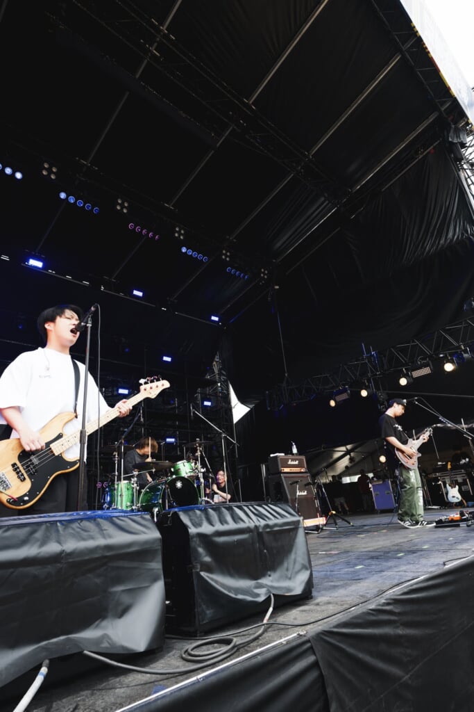 12時5分、SHANKを迎えるSEが響く中、街ブラを楽しむような感じでステージに登場した庵原将平(Vo, B)、松崎兵太(G, Cho)、早川尚希(Dr)。松崎がギターのコードを鳴らした直後、庵原が歌い出し「Surface」が始まった。イントロを歌った直後、「SHANKと言います、よろしく!」と庵原が挨拶。彼らの放つ軽快なリズムは、オーディエンスにステップを踏ませるだけでなく、心まで躍らせていく。曲を次々にたたみ掛けるにつれ、拳はあがり、人も舞い上がる太陽が丘になっていく。
