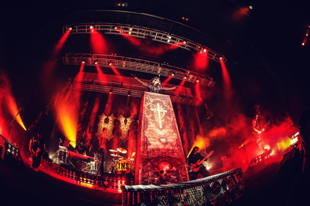 ステージ中央にそびえ立つ演説台からHYDEのシルエットが浮かび上がると、響き渡る歓声。アルバム『HYDE [INSIDE]』のオープニングを飾る、哀愁を帯びたインストゥルメンタル「INSIDE HEAD」が聴こえてくる。音が止まると真っ赤な光の中、アルバムの事実上の1曲目「LET IT OUT」に始まり、アグレッシヴなパフォーマンスをこれでもかと畳み掛けていく。