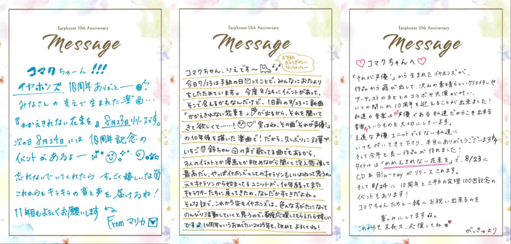 10周年を迎えた声優ユニット「イヤホンズ」が、本日7月23日(水)の「手紙の日」にちなみ、イヤホンズを支えてくれているすべてのファン(=通称コマクちゃん)に向けてメンバー直筆のメッセージを公開した。