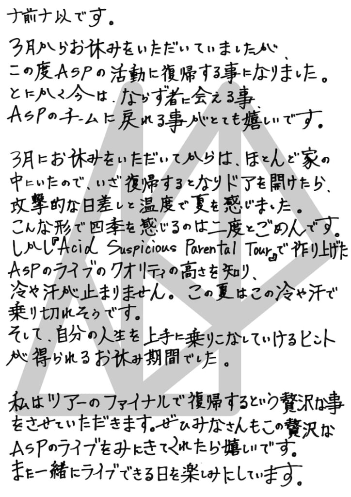 私はツアーのファイナルで復帰するという贅沢な事をさせていただきます。ぜひみなさんもこの贅沢なASPのライブを見にきてくれたら嬉しいです。また一緒にライブできる日を楽しみにしています。
