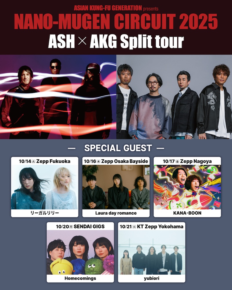 また、10月には<ASIAN KUNG-FU GENERATION presents “NANO-MUGEN CIRCUIT 2025” ASH×AKG Split Tour>の開催が決定している。10月14日のZepp Fukuokaを皮切りに大阪、名古屋、仙台、横浜と全国5都市を回るスプリットツアー。長年にわたり互いの音楽へのリスペクトと信頼を深めてきたASHとASIAN KUNG-FU GENERATIONだからこそ実現したスペシャルなスプリットツアーとなる。各公演には、Special Guestの出演が決定しKANA-BOON、Homecomings、リーガルリリー、Laura day romance、yubioriが各公演に登場する。