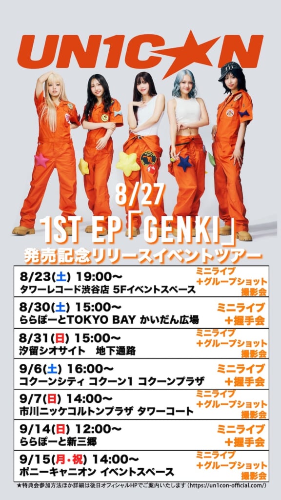 また、9月27日15時よりスペシャルリリースイベントの開催が決定した。内容は、ミニライブとトーク会、TikTok撮影会を予定している。イベントに参加するには1st EP『GENKI』に封入されている「ミニライブ&TikTok撮影会 参加抽選券」より、応募入力期間内に応募した人の中から抽選で参加可能となる。応募入力期間は、2025年8月26日~2025年9月15日23時59分で、場所は都内某所にて実施となるので商品が手元に届いたら早めに応募していただきたい。