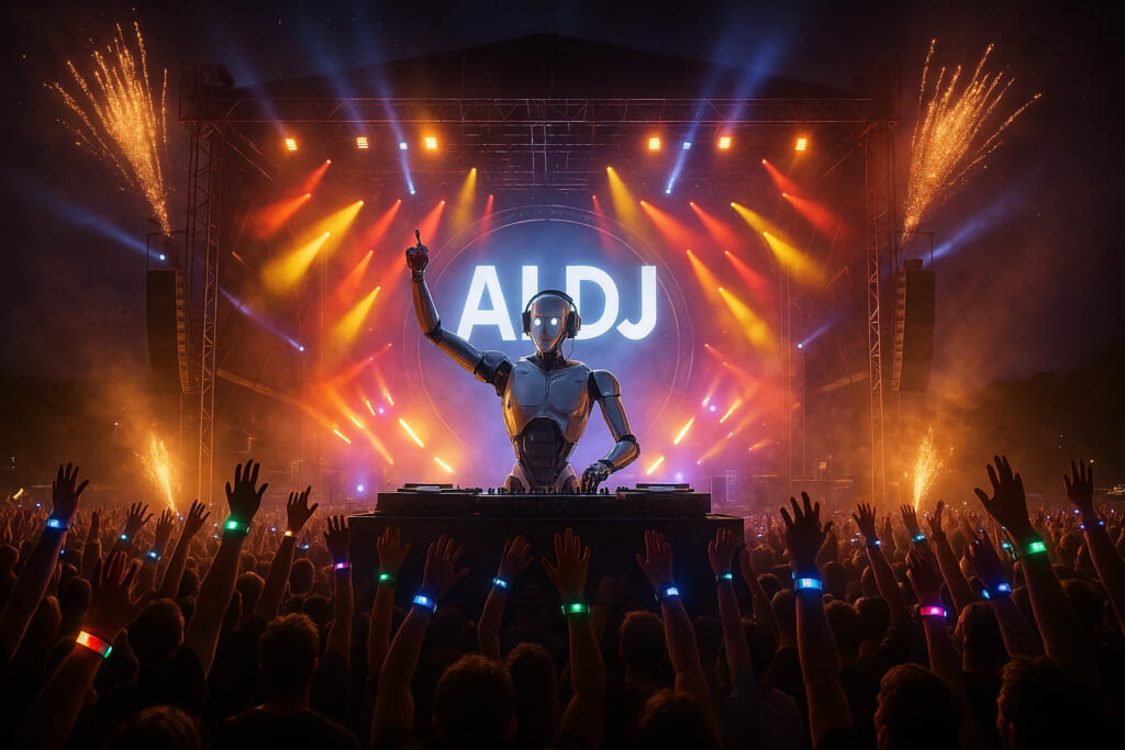 202×年夏、某ひたちなかで開催された実験的なフェスの一幕。AI DJが、リアルタイムに観客の動き・歓声・SNSの反応を解析し、BPMや選曲を変化させながらプレイを行った。BPMに合わせて手を上げ、光るリストバンドが同期し、ビジョンに映し出されたリアルタイム・レンダリング映像が酩酊感を加速させ、カメラが笑顔の熱狂を判定する。視覚と聴覚と運動性の快感が噛み合い、かつてない刺激的な体験が会場を包みこんだ。観客がノるのではなく、AIにノらされる時代の到来だ。