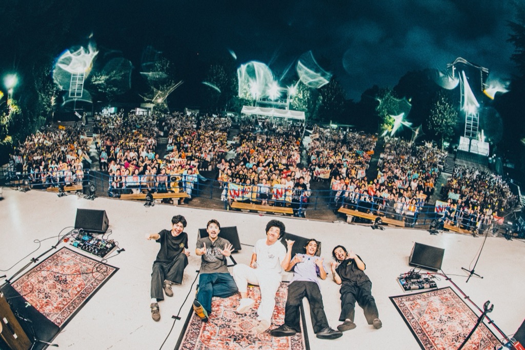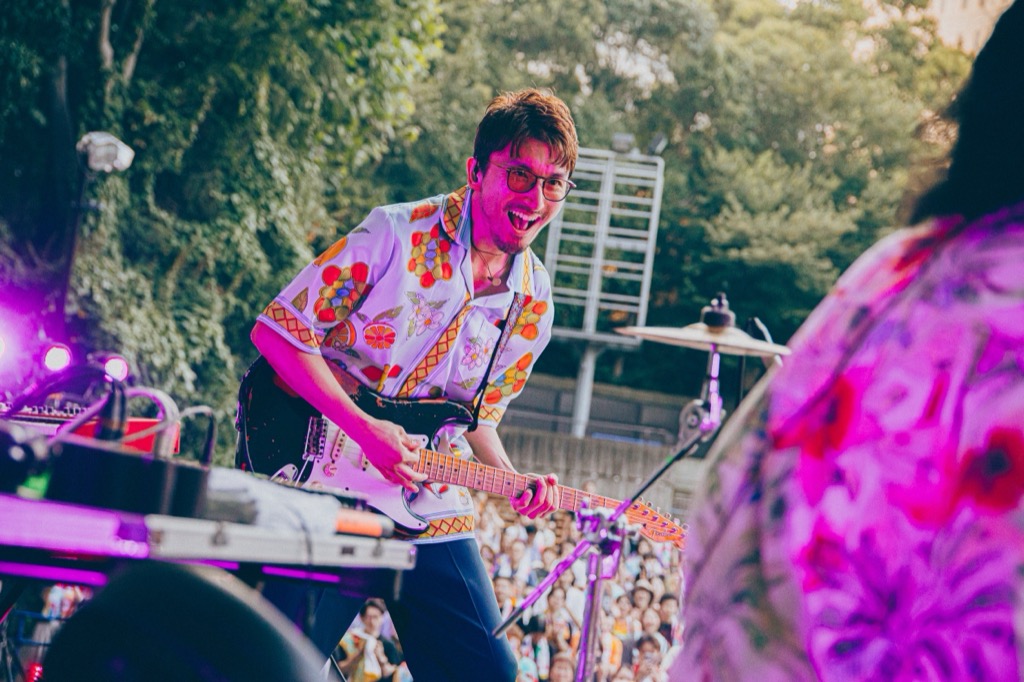 日も落ち、ステージの照明が映える時間帯には、この日のためにライブアレンジを施した「真夏の悪魔」を披露し、最新アルバムに収録され、FUJI ROCK FESTIVAL‘25でもプレイしたバラード曲「あったかい涙」では、真行寺の温かみのあるボーカルが野音に響き渡った。