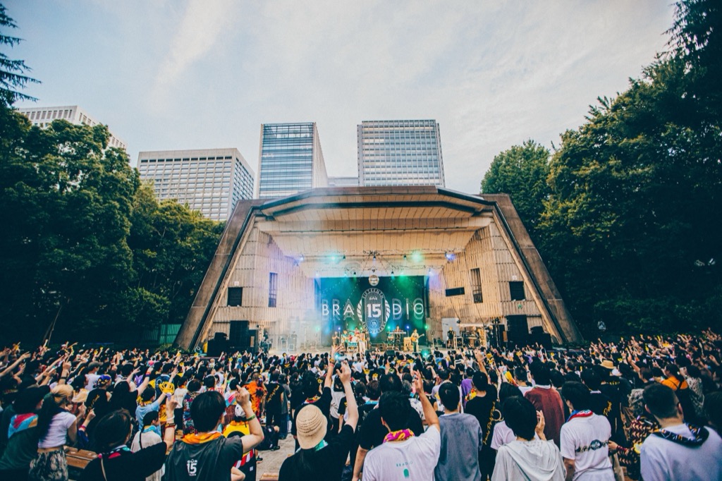 ステージには特大のミラーボールが吊るされ、ステージ後方の”BRADIO 15th ANNIVERSARY”と書かれたバックドロップが台風一過で真夏の様相を呈した”日比谷野音”を彩っていた。
