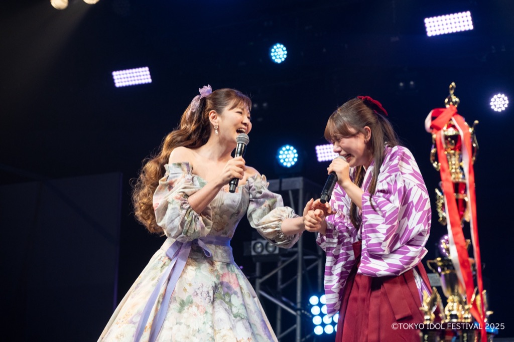 3日目に開催された<TIF2025ものまねFES>では、7月26日(土)に地上波で放送された『TIF2025 presents アイドルだらけのものまね王座決定戦』でアイドル界のものまね女王に輝いた石塚汐花(アイドルカレッジ)が南野陽子の「はいからさんが通る」を披露。するとサプライズゲストで、歌手デビュー40周年を迎えた南野陽子ご本人が登場。驚きと喜びで大号泣する石塚に優しく微笑みかけながら、TIFのステージで歌声を披露した。