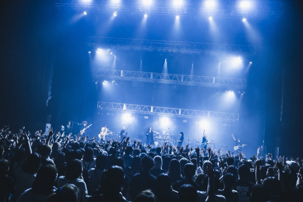 折り返し地点でイベントをさらに加速させたのは、今年28周年を迎えたMUCC。サポートメンバーのAllen(Dr)と吉田トオル(Key)とともに逹瑯、ミヤ、YUKKE(B)が定位置に着くやいなや、「invader」で勢いよくライヴをスタートさせた。研ぎ澄まされたサウンドの攻撃性と、フロント3人が並んだ瞬間の威圧感は、多彩な出演者の中でも随一だ。