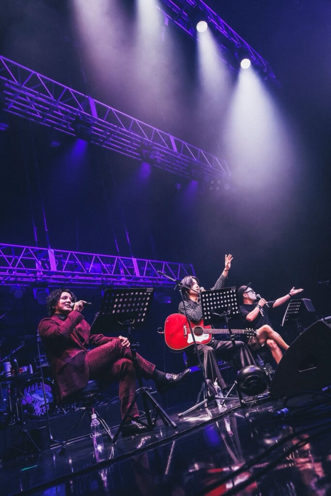 まず、開演前のお楽しみとして、DEZERTの千秋(Vo)を進行役に「千秋のおもてなしwith小柳(夕闇に誘いし漆黒の天使達)&団長(NoGoD)」が観客を出迎える。開場前からスタンバイし、少しずつ増えていく観客とゆるいトークを展開。千秋のアコースティックギターを伴奏に、NoGoDの「カクセイ」や、夕闇に誘いし漆黒の天使達の「時間が戻ったら抱きしめて…」、L’Arc-en-Cielの楽曲などを披露した。最後には千秋が即興で歌い始めたオリジナル曲「ちょんまげ」を3人で歌い繋ぎ、「♪WE ARE サムライ!」という謎のコール&レスポンスまで生みだして、会場をしっかり温めた。
