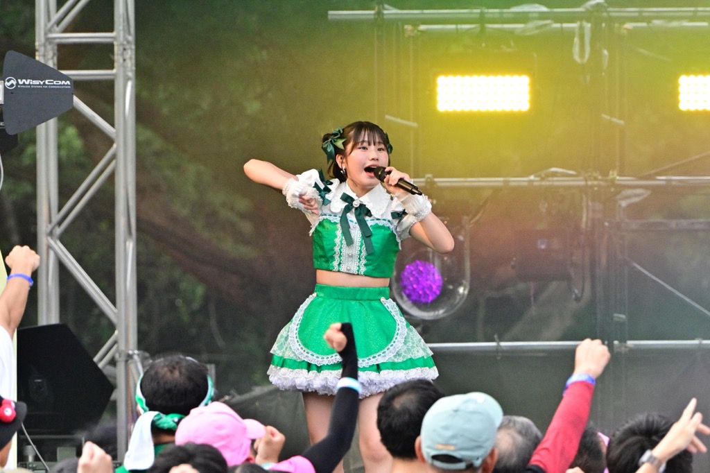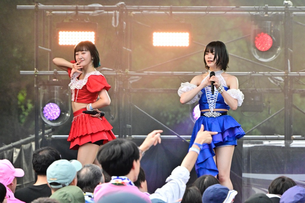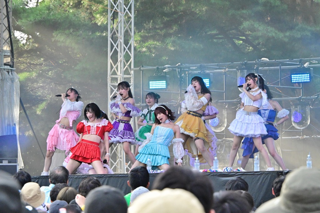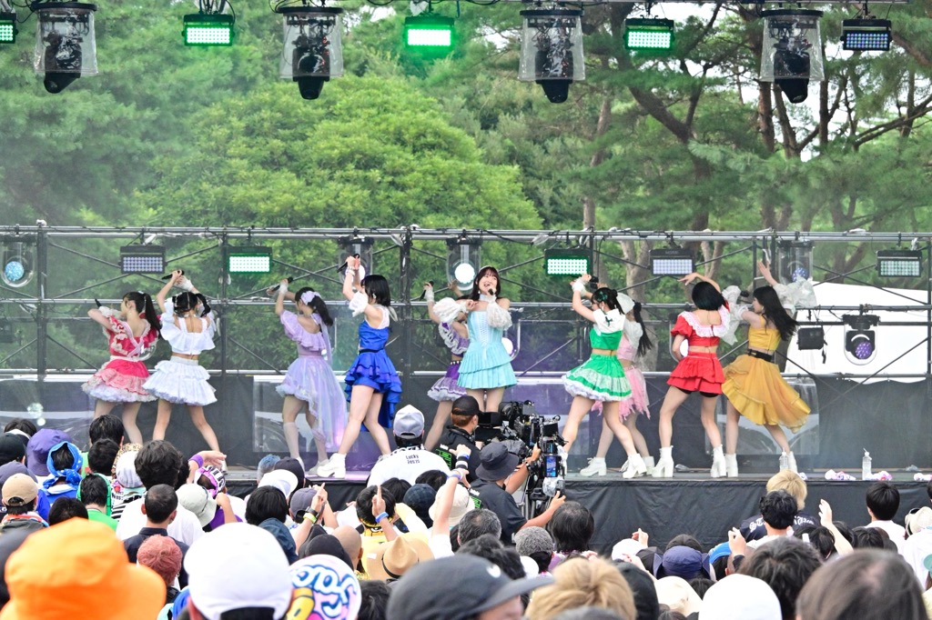 前半戦はつばきファクトリーの可愛さがそれぞれの個性とともに花開いた。河西結心、秋山眞緒とボーカルワークの強い2人にこれまた豫風瑠乃の巧みなボーカルが重なるパートから、しっかりと耳を惹きつける福田真琳の歌声、合間を支えるリーダー・谷本安美とサブリーダー・小野瑞歩の安定感がフレンズをほっとさせてくれる。そして小野田紗栞の見せる、たまにあざといまでのアイドルパフォーマンスの実に華やかなこと。昨年加入しLuckyFesには今年初参加となった石井泉羽、村田結生、土居楓奏の3人は先輩メンバーに負けじとフレッシュな笑顔をぶつけてきた。M1ラストをラインダンス風ステップで締めくくると、会場からの喝采が彼女たちを包みこんだ。