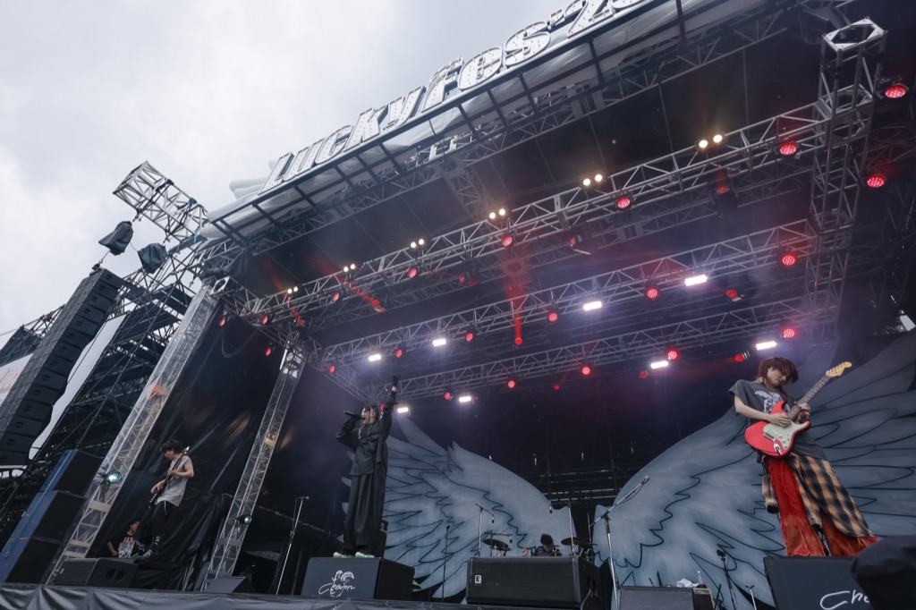 そんな思いを巡らせていると、詰めかけたフレンズ(LuckyFes来場者)が大きなクラップを鳴らし、谷絹茉優(Vo)のバカでかい挨拶からまずは届けられたのは「サクラループ」。オープニングを飾るにふさわしい軽快なリフとリズム、調子はどうだい、と語りかけるような歌のアプローチもいい。中盤にはKtjm(G)のギターソロも飛び出し、フレンズを一気に引っ張っていく。
