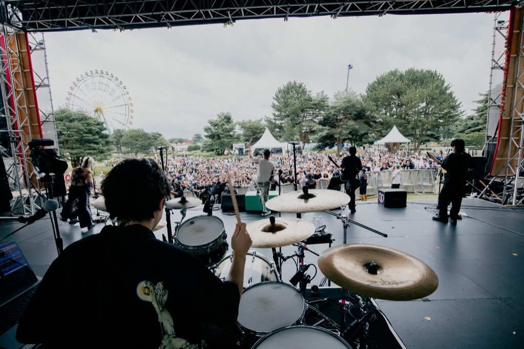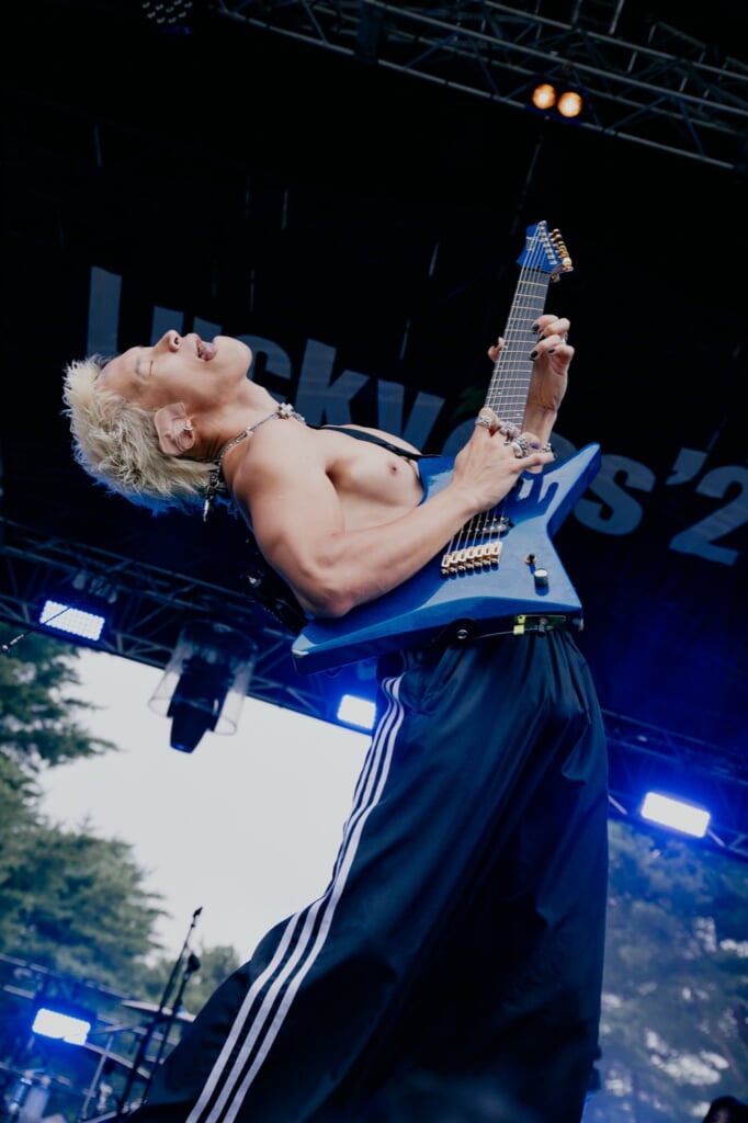 「雨降ってませんね。LuckyFes、初めて出させてもらってます。俺らを観られてラッキーという日にしたい。力貸してください。ここからガッツリ暴れていただきたい。動いたり、暴れたり、踊ったり、好きなんでしょ?」──KAITO(Vo)のMCを挟んで演奏再開。一斉にヘッドバンギングを始めた人々の動きが、まるで地面に大量の杭を打ち込むかのようだった「BLUE ROSE」。興奮の限界突破をした人々が大量発生すると清々しいムードが生まれるのだなと実感させられた「LEAVE ME OUT」……夢のような爆音天国だった。
