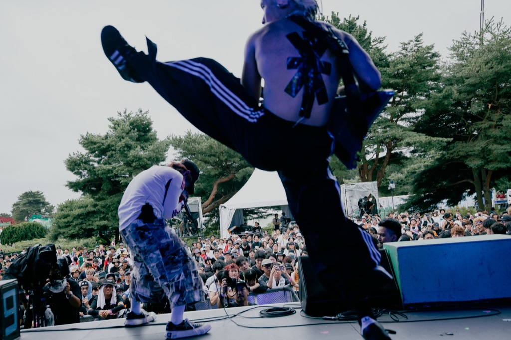 続いて「SLAY!!」。激しく声を上げながら飛び跳ねる観客がフィールド内にどんどん増えている。盛り上がる人々が沸騰した鍋の中みたいな様相を呈する様が視界に飛び込んできて、野外ライブならではの楽しさを改めて実感。そして「NO!」も強烈だった。ギター、ベース、ドラム、シンセサイザー、シャウト、スクリーム……音の刺激の塊がものすごい勢いで押し寄せてくるのを全身で受け止めると、本能に任せて興奮を露わにするしか感情を落ち着かせる術はない。Paleduskは、序盤の3曲の時点でとんでもないエネルギーの連続放射を喰らわせてきた。