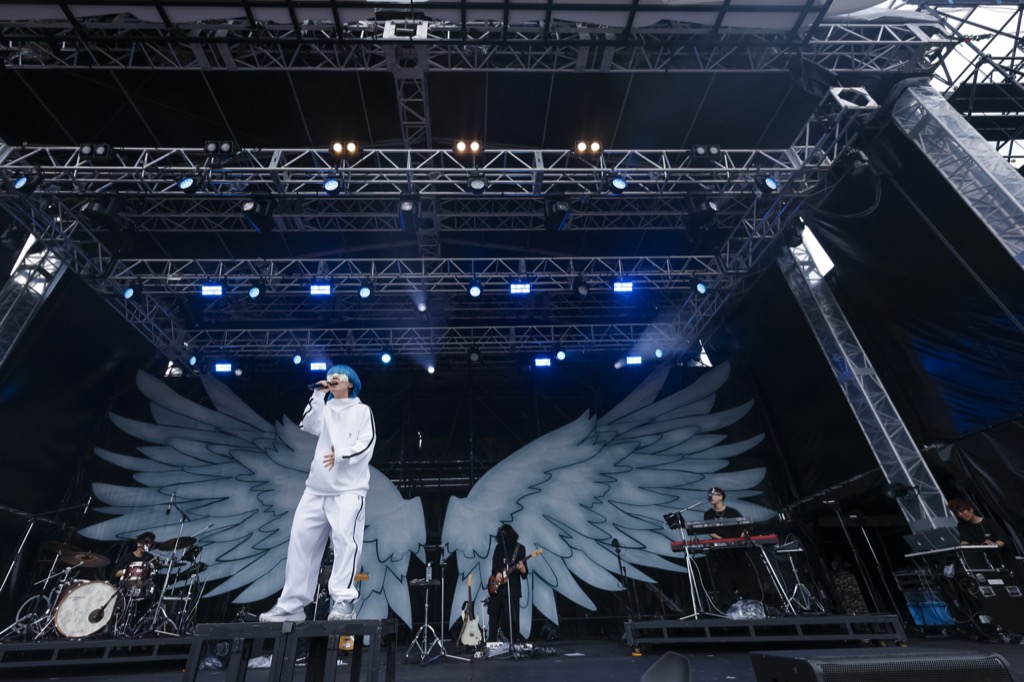 真昼のWING STAGEには、<LuckyFes>連続出演中のyamaが登場した。バンドのオープニングセッションに合わせて手拍子していたフレンズ(LuckyFes来場者)は、yamaが姿を見せると手を振って迎え入れる。