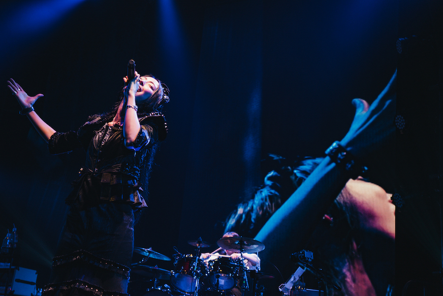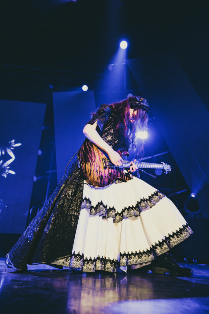 出し惜しみのない選曲によるあくまでアッパーな演奏プログラムは、その後も歩調を乱すことなく快調に進んでいく。曲調の広がりによりお給仕全体を通じての起伏も豊かになり、「Forbidden tale」のような展開が豊富でドラマ性のある楽曲が代表曲の仲間入りをしているところにも、バンドの成熟と足並みを揃えた変化が感じられる。また、楽曲同士が織りなす物語の随所に設けられたセッションパートから伝わってくる各メンバーの持ち味も、従来以上に際立ってきている。MISAがかき鳴らす、うごめくような低音と、AKANEの繰り出す切れの良いビートが会話をしているかのような場面もあれば、お立ち台に上がったKANAMIがギターヒロイン然としたまばゆい光を放つ。5人それぞれの存在感が、演出的に強調されているのではなく、当たり前のように際立っているのがわかる。