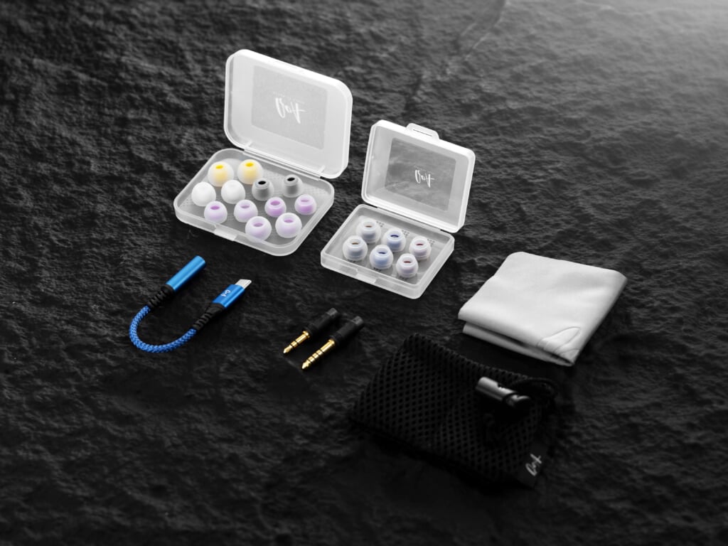 QoA Misty Blue インイヤーモニター 1ペア|OCC銀メッキ0.78 2pin、3.5mm + 4.4mm 交換ケーブル 1本|シリコンラバーイヤーチップ 9セット|Type-C – 3.5mm変換アダプター 1個|レザー収納ケース 1個|2ポケットIEMポーチ 1個|クリーニングクロス 1枚|ユーザーマニュアル 1冊