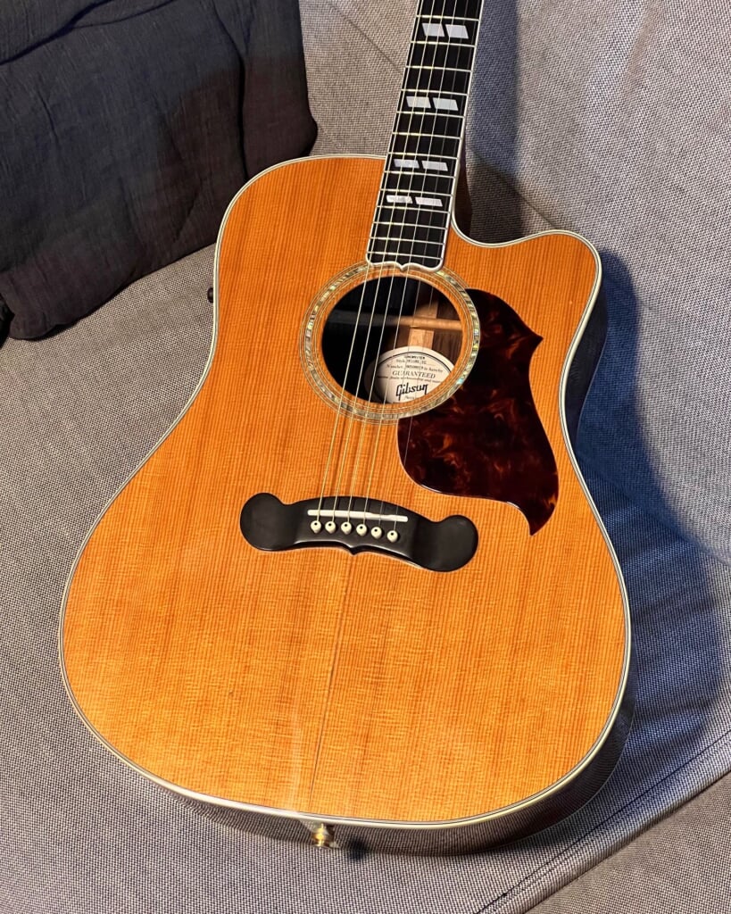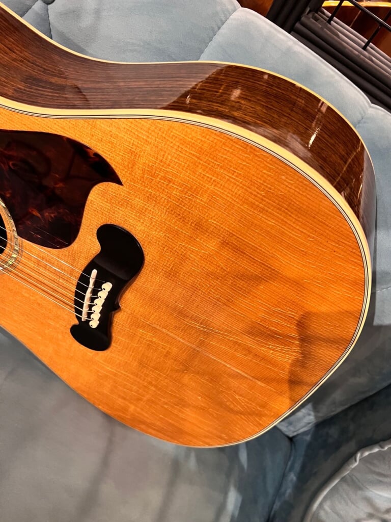 オレンジ色に焼けたスプルースの打痕や擦り傷、目を引く無数の激しいウェザーチェックなどから、17年間あらゆるところで奏でられてきたであろう貫禄を感じられます。ロングスケールとローズウッドによる透明感のあるサウンドが心地よく、それでいてエボニー指板の影響による立体的で芯のあるサウンドからはギブソンの泥臭さも感じさせてくれます。普段はJ-200を愛用しているのですが、こちらのカッタウェイモデルは非常に頼もしい相棒です。
