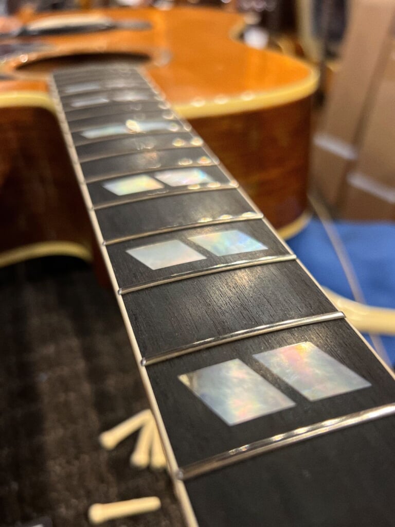 これは今年、東京のAdvance Guitarsで購入した2008年製のSongwriterなのですが、現行モデルのローズウッド指板ではなくエボニー指板という中古市場でもレアな個体。ギブソンが2011年頃にエボニーの件でやらかしたということもあってか、この年以降のソングライターは全てローズウッド指板になっていました。