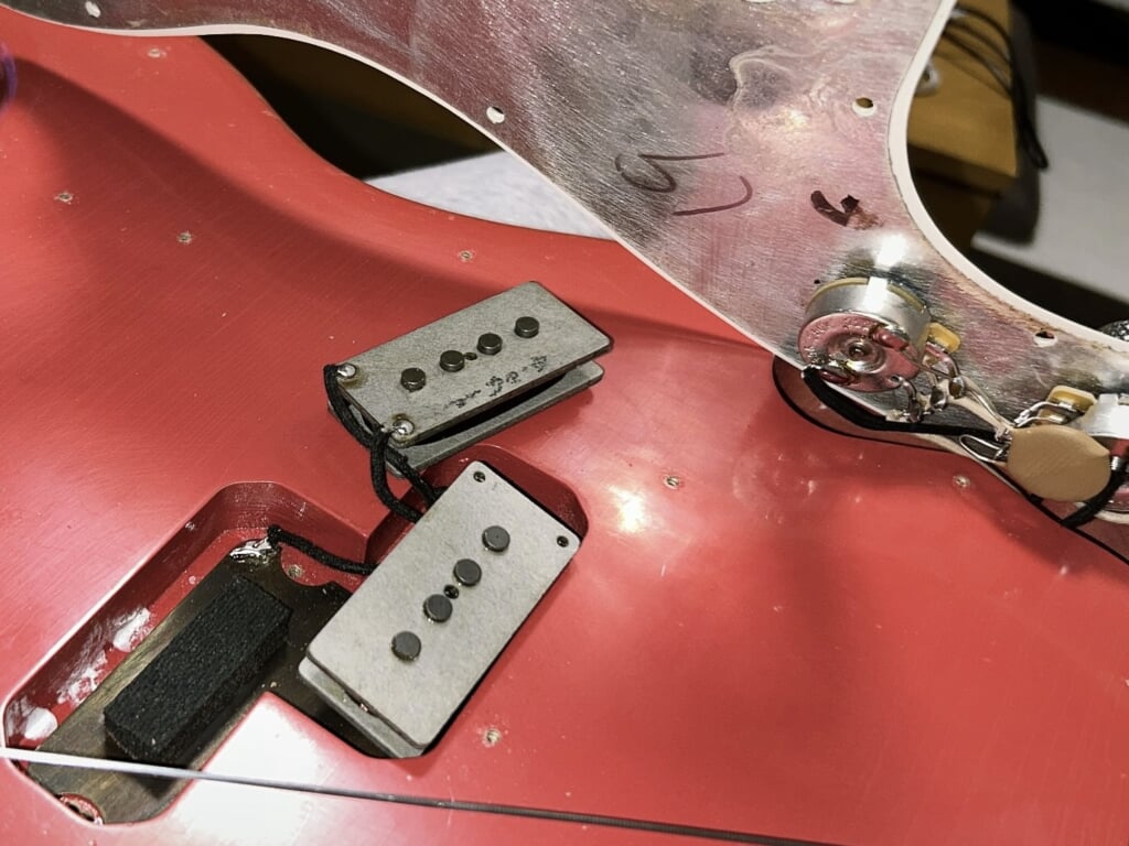 Reverbにて運良く値下げされていたところをなんとか買えた1966年製のネックと、細すぎる指定の上MJTにオーダーしたボディをガッチャンコし、パーツ類も細すぎる拘り(ワガママ)を発動させ、66年のネックに合わせて可能な限りCBS期の仕様に近いものをチョイスしました。
